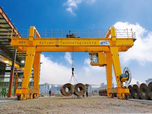 门式胜游网页版页面(龙门吊)是一种用于室外的货场、料场货、散货的装卸作业的胜游网页版页面。它的金属结构像门形框架,可以在地面的轨道上行走,主梁两端可以有悬臂。